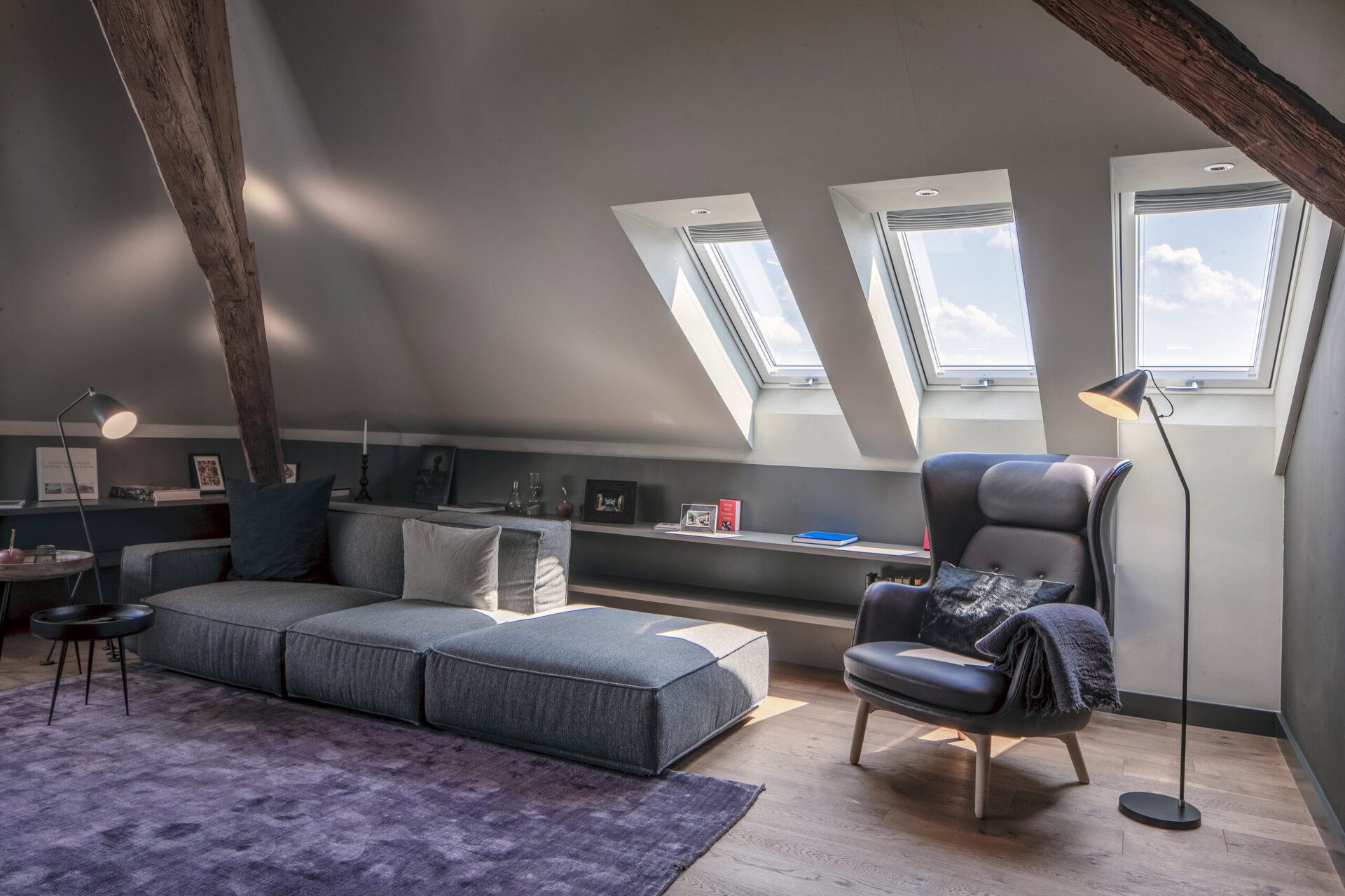 Unter freigelegten Holzbalken erstreckt sich die Rooftop Suite über 75m². Die einladenden, privaten Räumlichkeiten wurden geschickt mit einem separaten Wohn- und Esszimmer, einem Badezimmer en Suite mit freistehender Badewanne, Dusche und Toilette abgegrenzt. Die eingebauten Dachfenster eignen sich optimal zum Betrachten des Sternenhimmels. Veredeltes Interieur und eine Mischung von sorgfältig ausgewählten, handgemachten Möbelstücken und Kunstwerken sowie eine kleine zimmerinterne Bibliothek runden die Rooftop Suite ab.