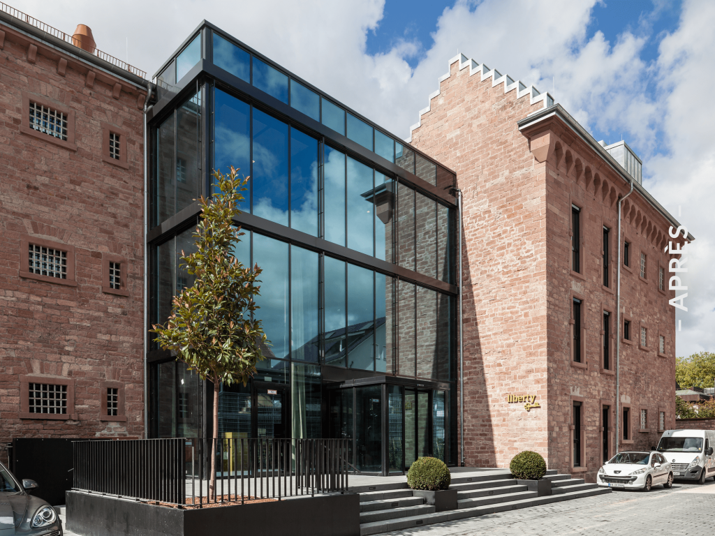 Après deux années de planification, les plans de l’architecte d’origine ont été rejetés. Celui-ci avait prévu un bâtiment central avec des chambres entre les deux bâtiments historiques. Les couloirs auraient été clairement réduits afin d’obtenir plus de mètres carrés à louer. On aurait ainsi considérablement perdu le caractère historique. Les maîtres d’ouvrage ont plutôt insisté pour un corps en verre filigrane qui recouvre maintenant l’ancienne cour de la prison et qui abrite le hall, le restaurant et le bar. Certes, on a ainsi perdu quelques chambres, mais on a créé le caractère unique qu’offre aujourd’hui le bâtiment.